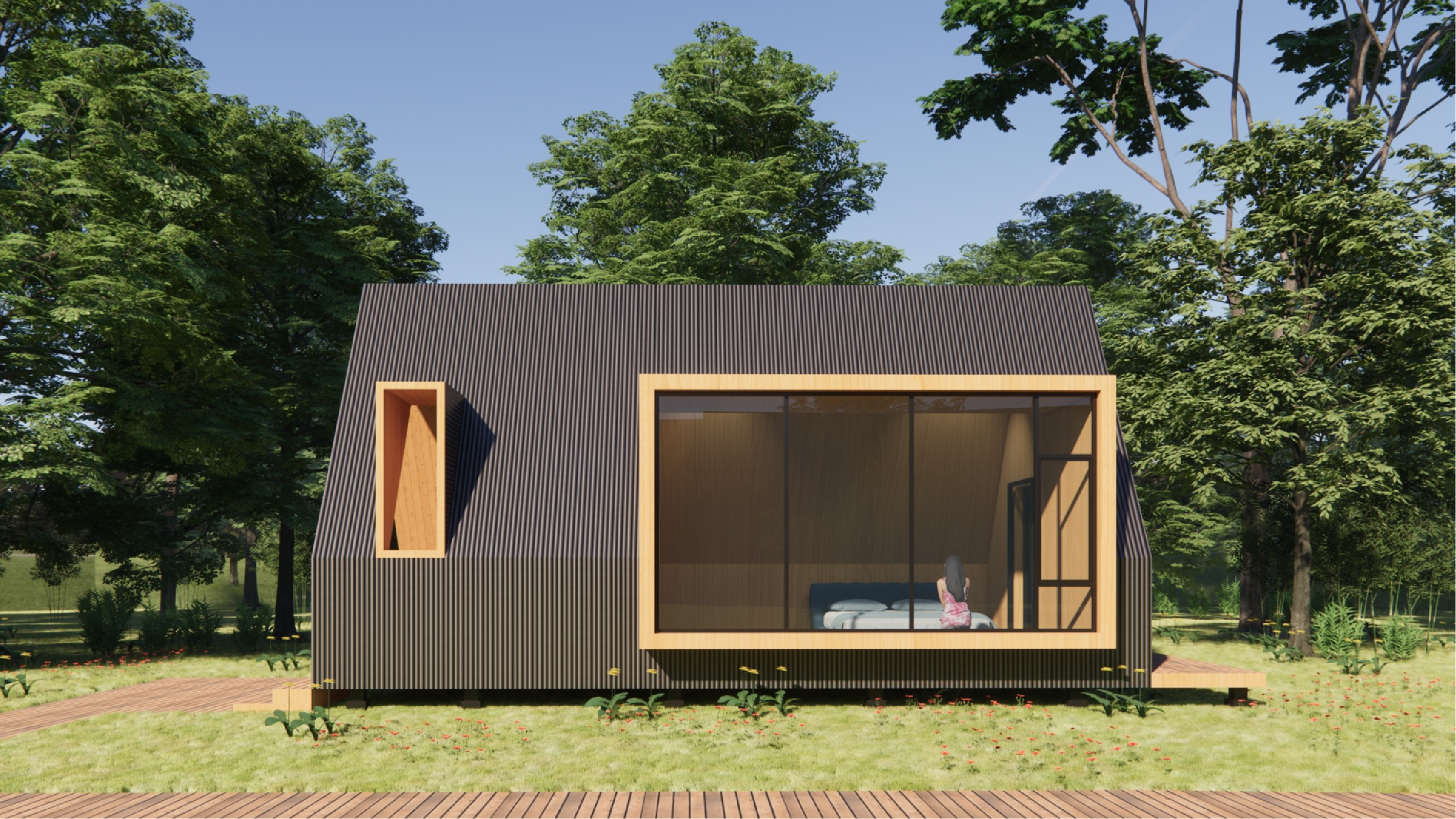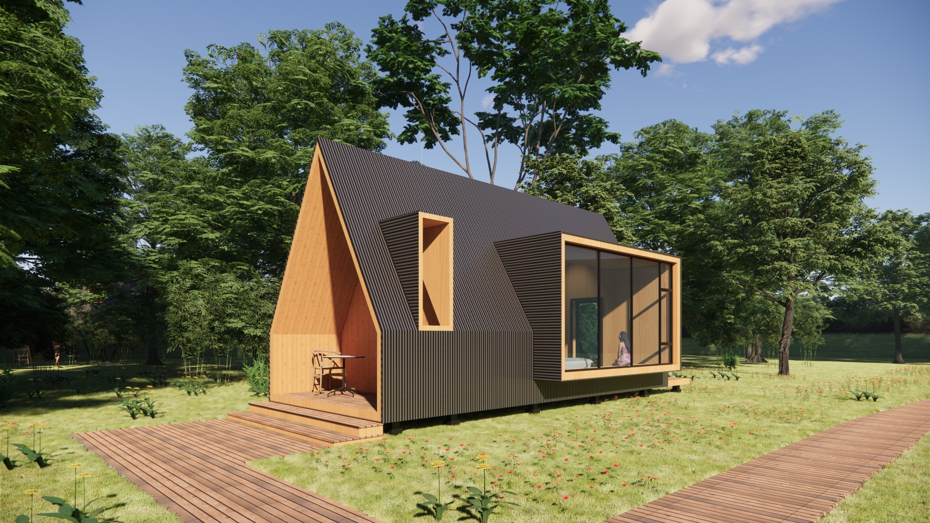 一居室33.72㎡紧凑型布局, 带有11㎡的入口平台和户外露台, 进门布置紧凑的卫生间和洗漱台, 卧室起居室的大景观窗朝向风景, 窗台上布置坐垫、茶桌供客人休息, 温馨舒适的独栋度假木屋布局。