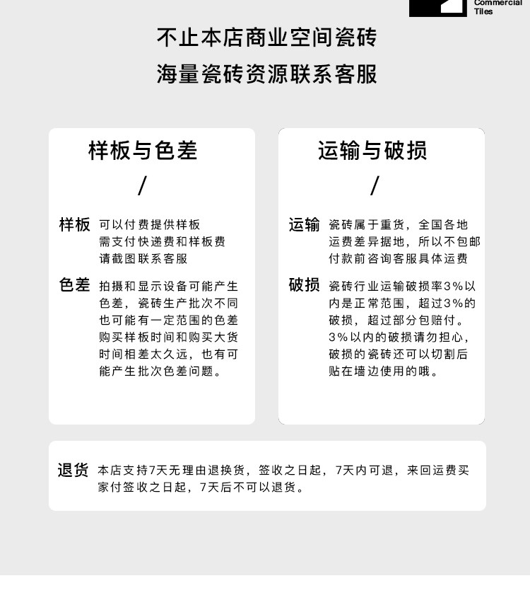 用户在收到货物后请立即检验产品包裹,若发现任何包装规格、数量、品种不符,外观毁损、短缺或缺陷,请在2个工作日内将能说明相关问题的产品外观照片,反馈给我方客户服务部,我们会第一时间核实具体情况,为您办理退换货。