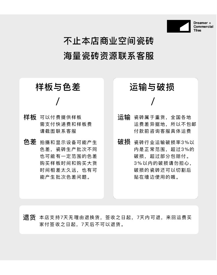 用户在收到货物后请立即检验产品包裹,若发现任何包装规格、数量、品种不符,外观毁损、短缺或缺陷,请在2个工作日内将能说明相关问题的产品外观照片,反馈给我方客户服务部,我们会第一时间核实具体情况,为您办理退换货。